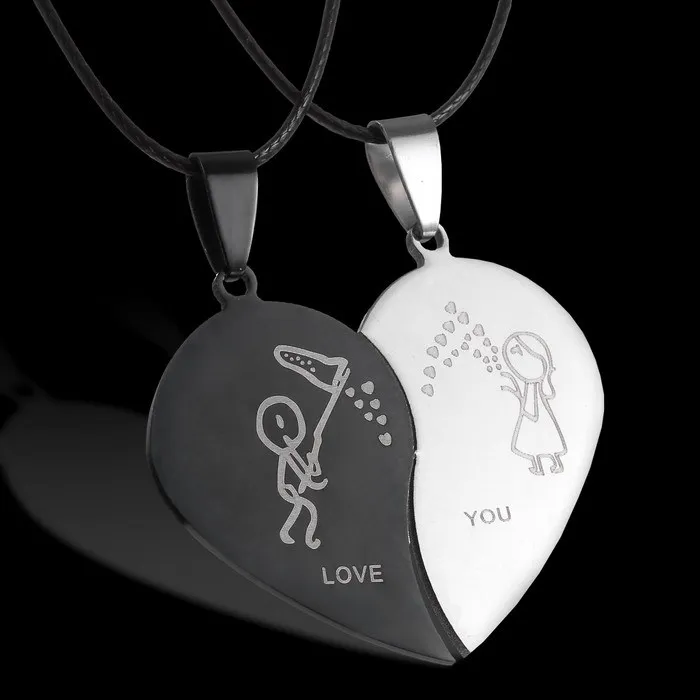Les pendentifs en acier inoxydable forment un cœur brisé qui s’assemble quand vous êtes réunis.