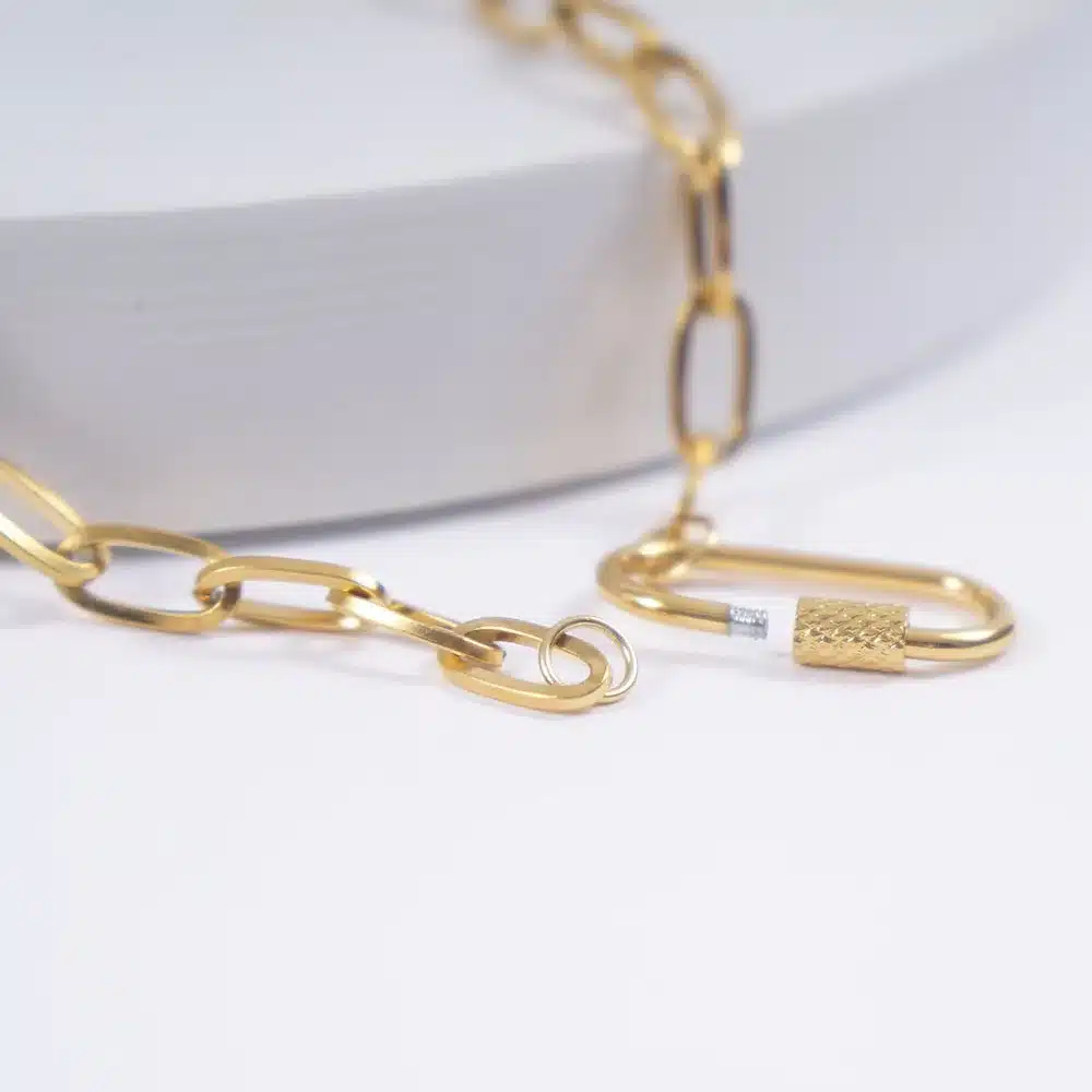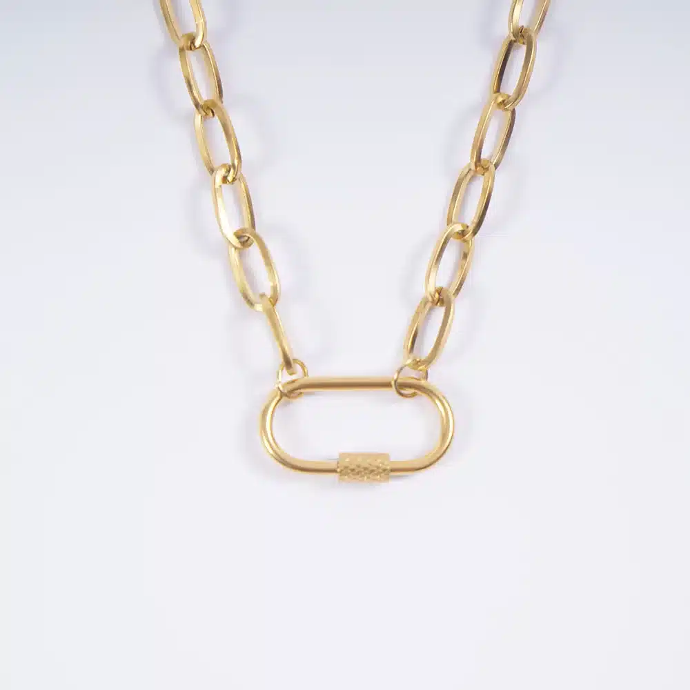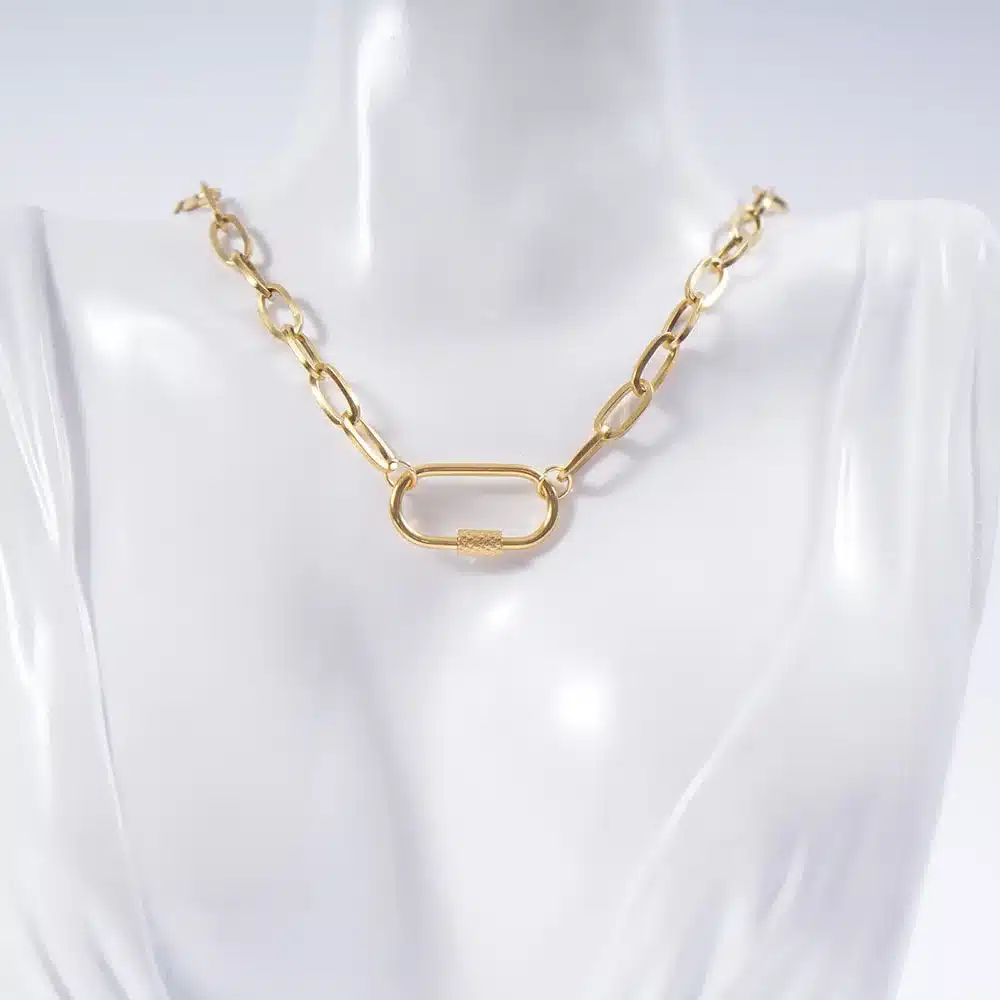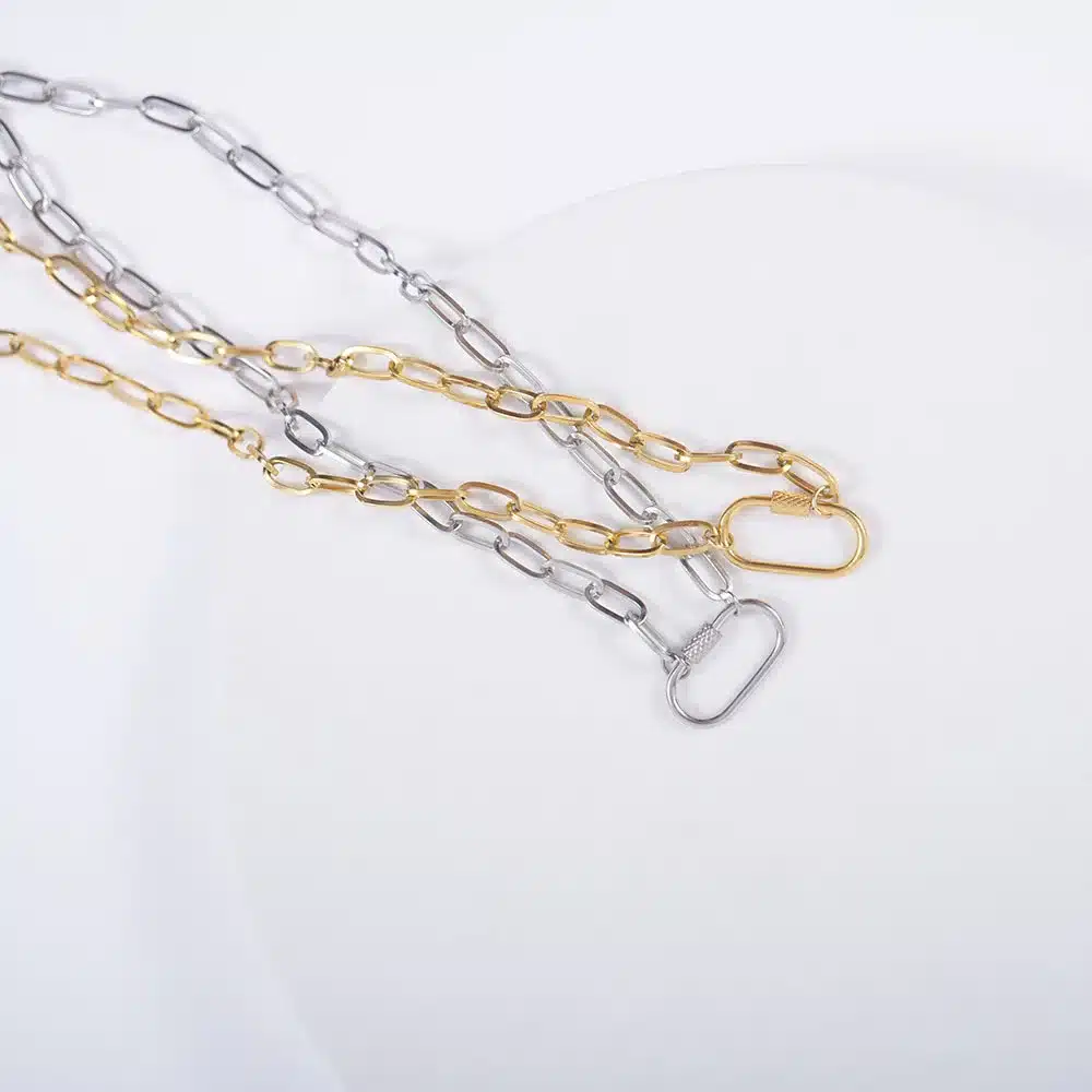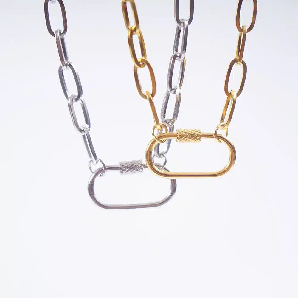 Ce lot de deux colliers en commun couple présente un design moderne et minimaliste, basé sur un maillon central en forme de mousqueton arrondi.