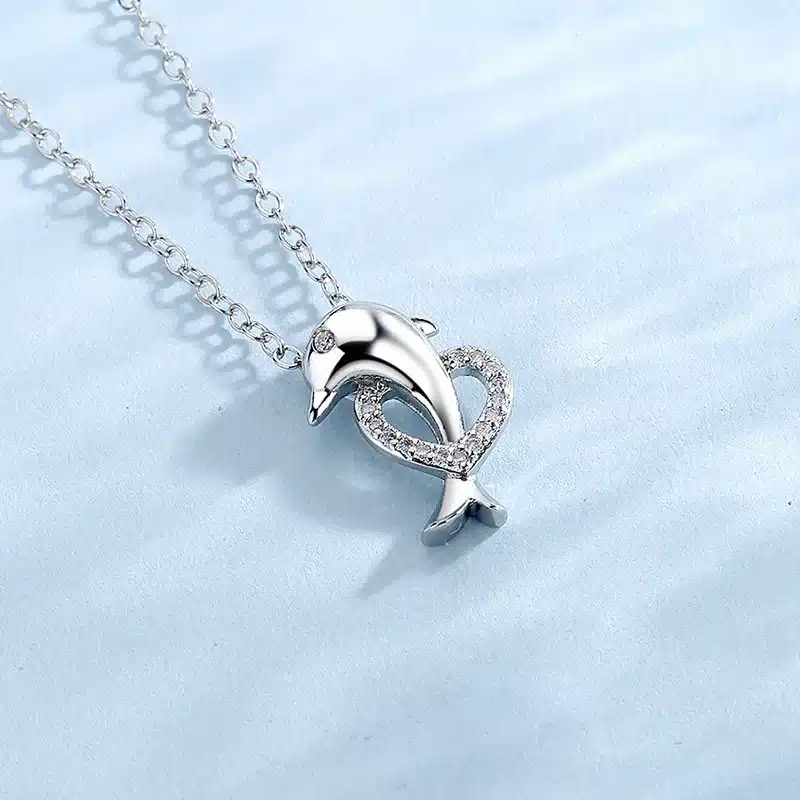 Son pendentif en forme de dauphin formant un cœur est serti de pierres en zirconium scintillantes qui captent la lumière et apportent une touche lumineuse et raffinée.