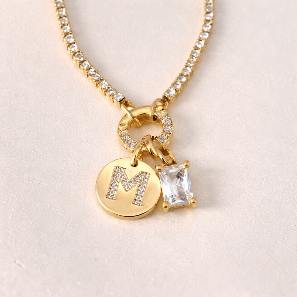 Le pendentif combine un médaillon rond doré gravé avec une lettre initiale incrustée de strass et une pierre rectangulaire façon diamant montée à côté, ce qui donne un rendu à la fois personnel et élégant.