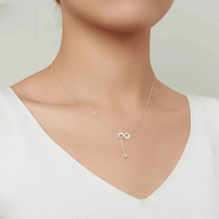 Le collier couple forever élégant pour femme affiche un symbole forever avec deux anneaux entrelacés, prolongés par un petit cœur suspendu pour une touche tendre et visible.