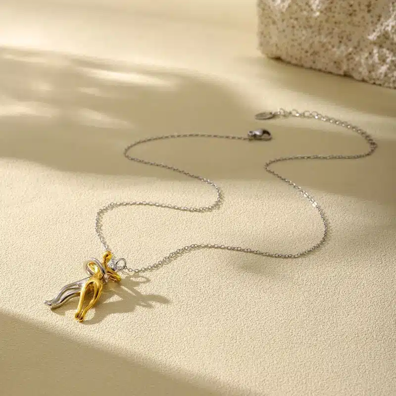 Ce lot de deux colliers affiche un pendentif avec deux silhouettes enlacées, l’une dorée et l’autre argentée, qui forment une étreinte pleine de tendresse.