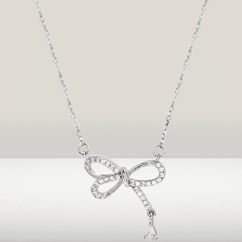 Le pendentif de ce collier a la forme d’un nœud serti de zircons brillants, un motif qui capte la lumière et qui attire le regard sans être tape-à-l’œil.