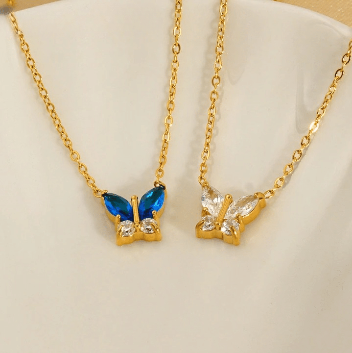 Le collier couple papillon femme doré se distingue par son design simple et élégant, facile à associer à toutes les tenues.