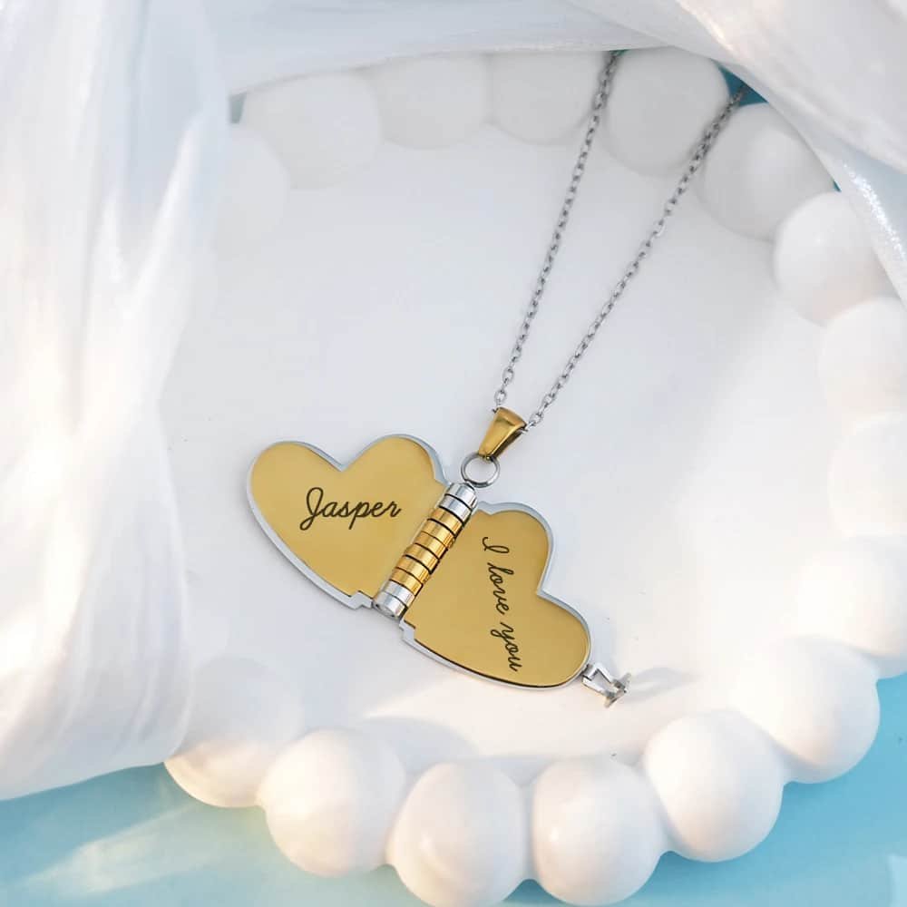 Le collier couple personnalisé coeur femme reste léger et se porte aussi bien avec un pull simple qu’une tenue plus habillée.