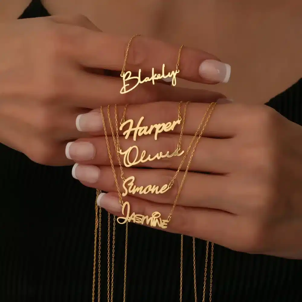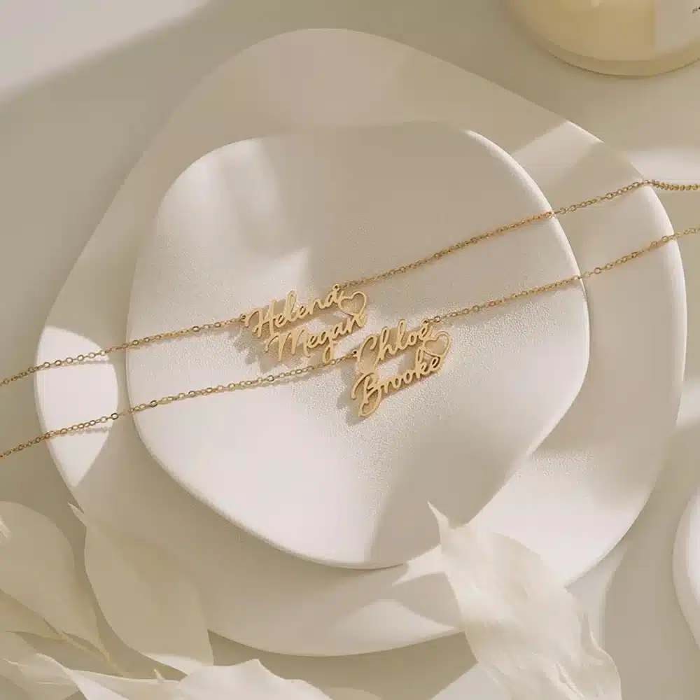 Ce collier couple vintage symbolique femme affiche deux prénoms en écriture cursive reliés par un petit cœur, créant un bijou qui raconte votre histoire d’amour.
