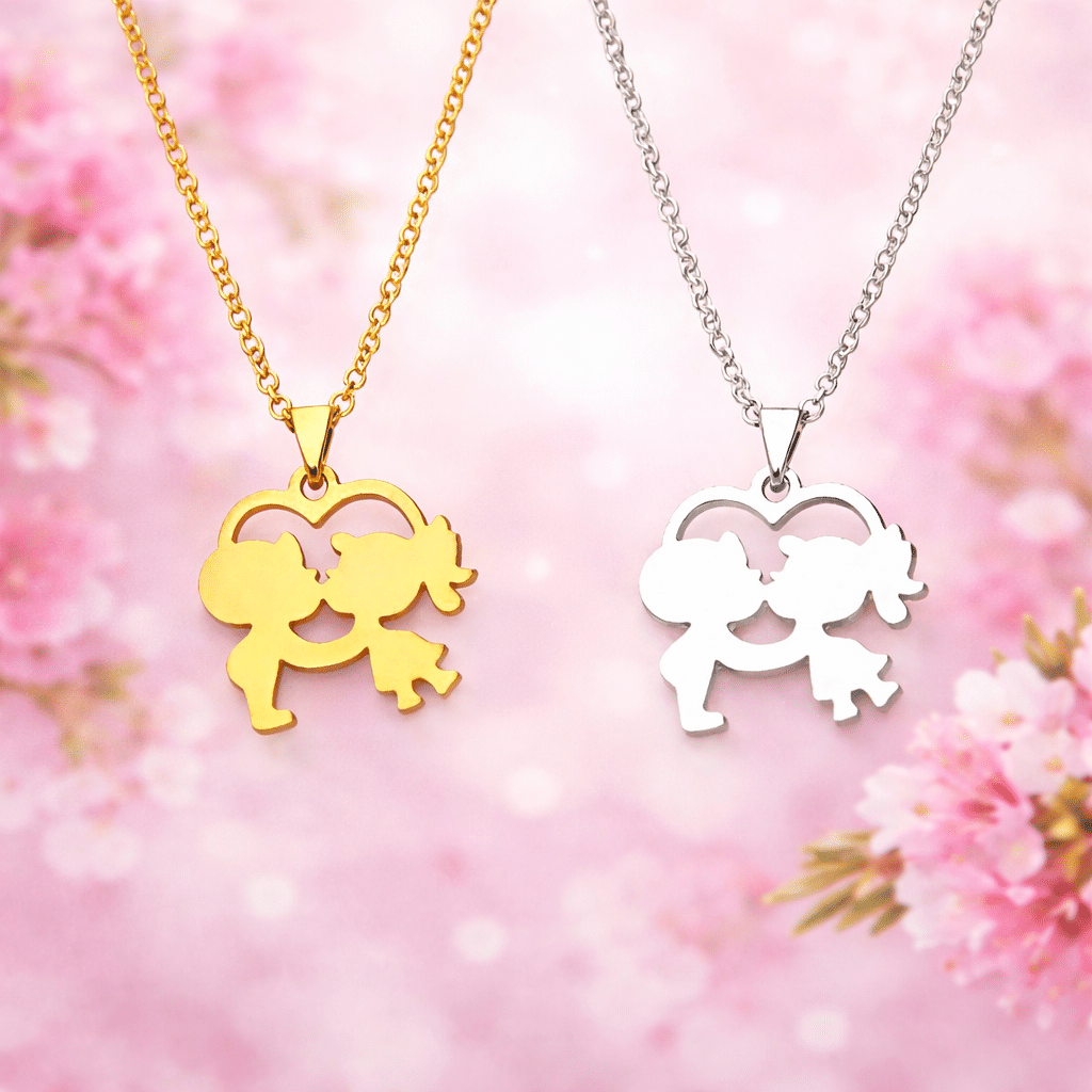 Chaque pendentif représente une silhouette masculine et féminine se tenant la main sous un cœur ajouré, créant une scène pleine de tendresse.