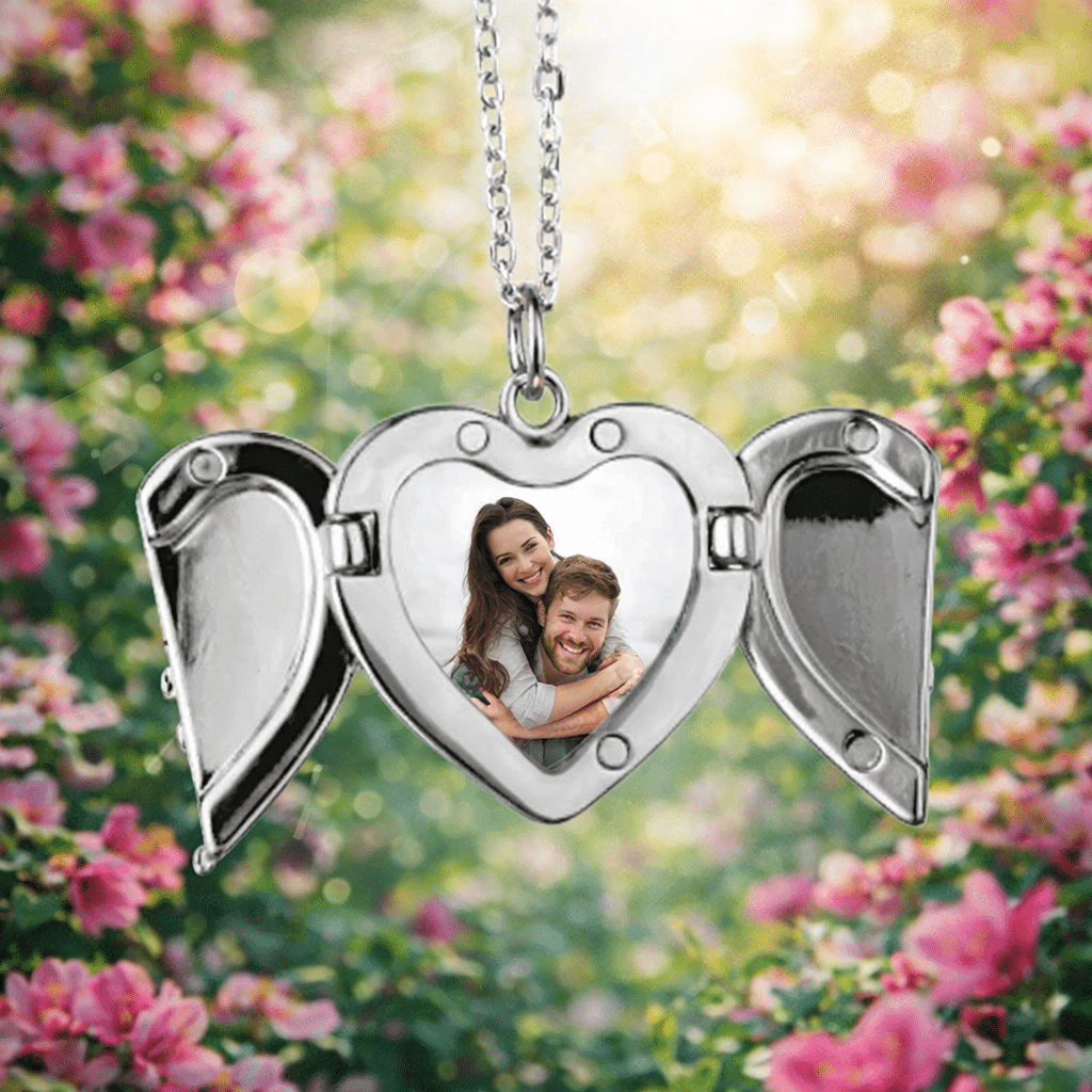 Le pendentif en forme de cœur s’ouvre en deux ailes stylisées pour révéler à l’intérieur une photo personnalisée que vous pouvez choisir.