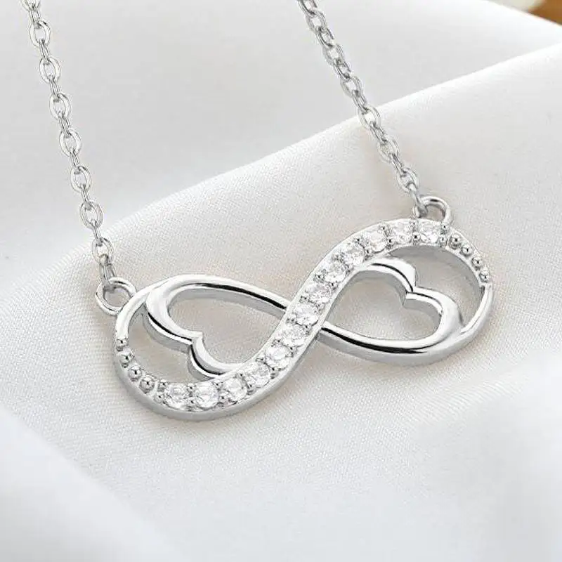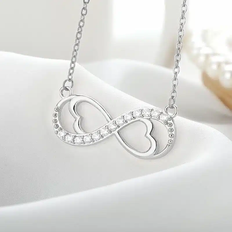 Le pendentif symbole infini intégré à un cœur délicat crée un bijou chargé de sens.