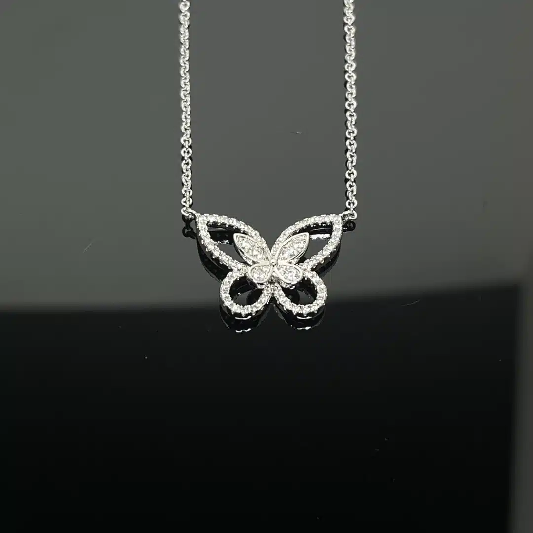 Le pendentif de ce collier représente un papillon serti de zircons brillants, avec des détails fins qui donnent l’impression que les ailes scintillent à chaque mouvement.