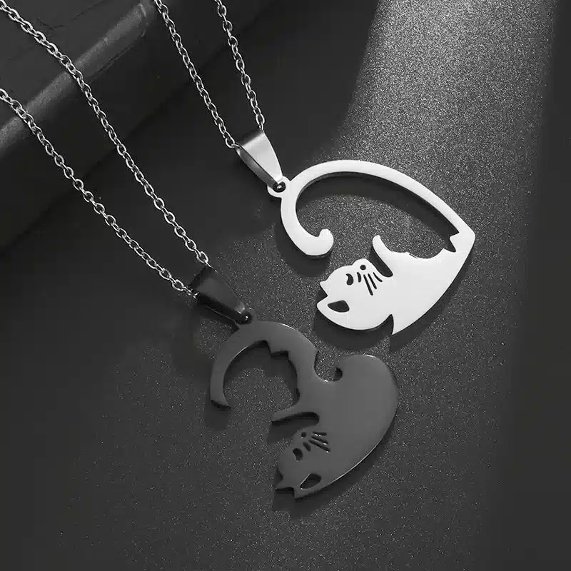Le collier pendentif cœur couple est un lot de deux colliers pensés pour les amoureux des chats et des symboles tendres.