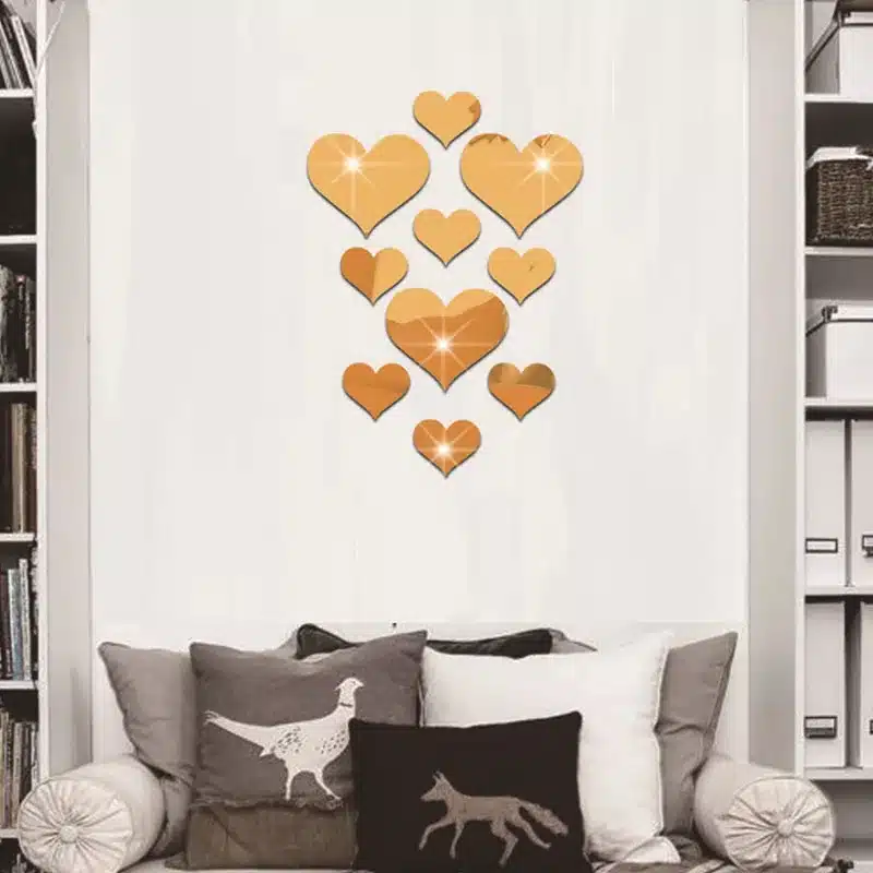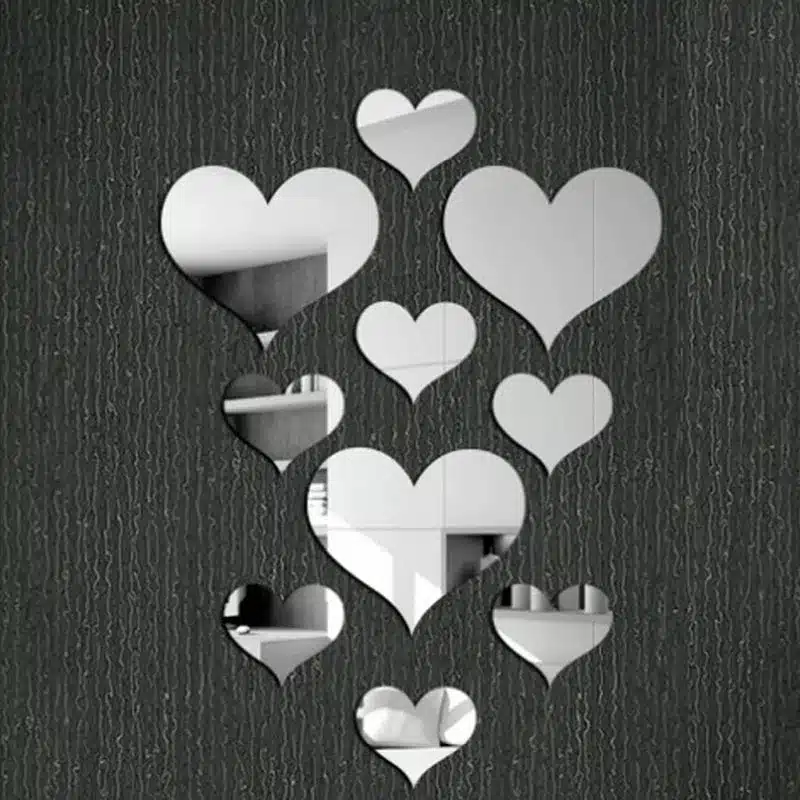 Lot de dix cœurs en acrylique effet miroir pour transformer vos murs en une décoration pleine de charme.