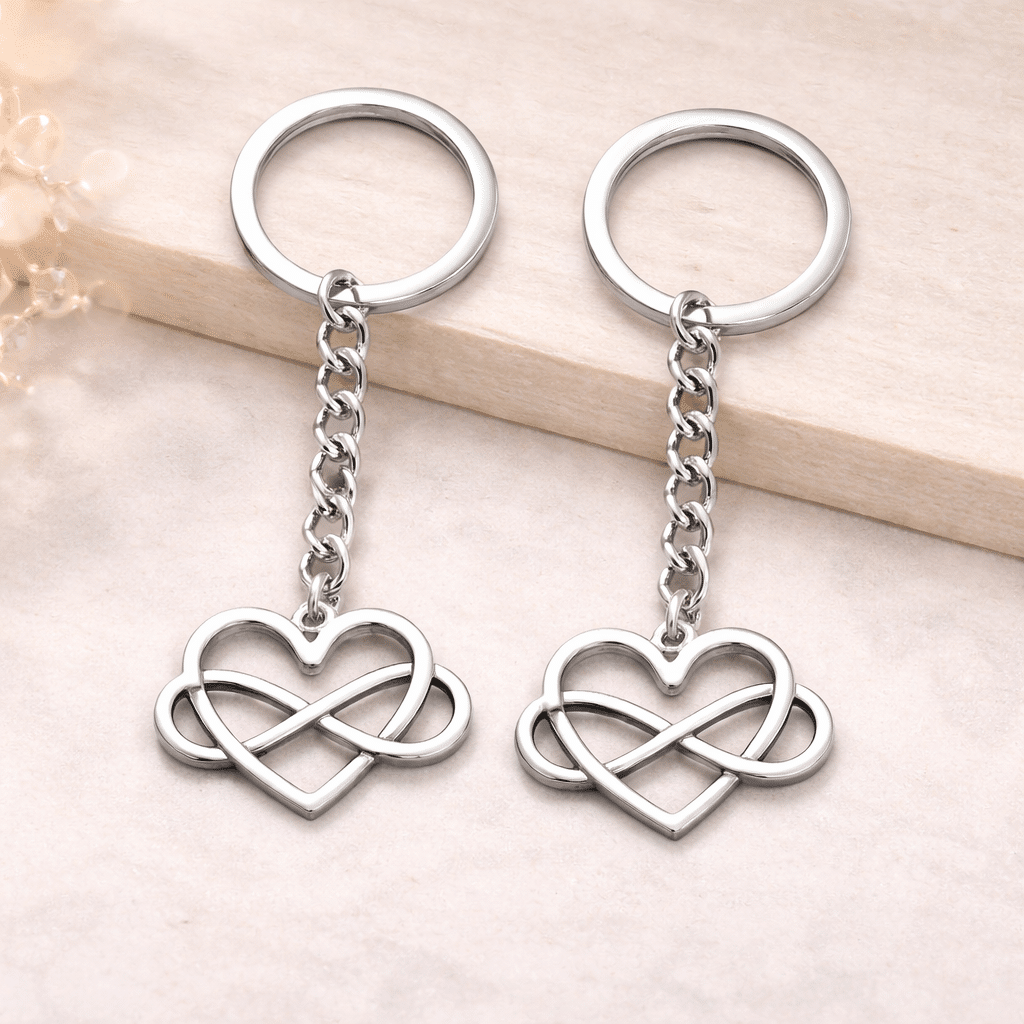 Ce lot de deux porte clés couple coeur représente un cœur enlacé par le symbole de l’infini pour représenter un amour sans fin.