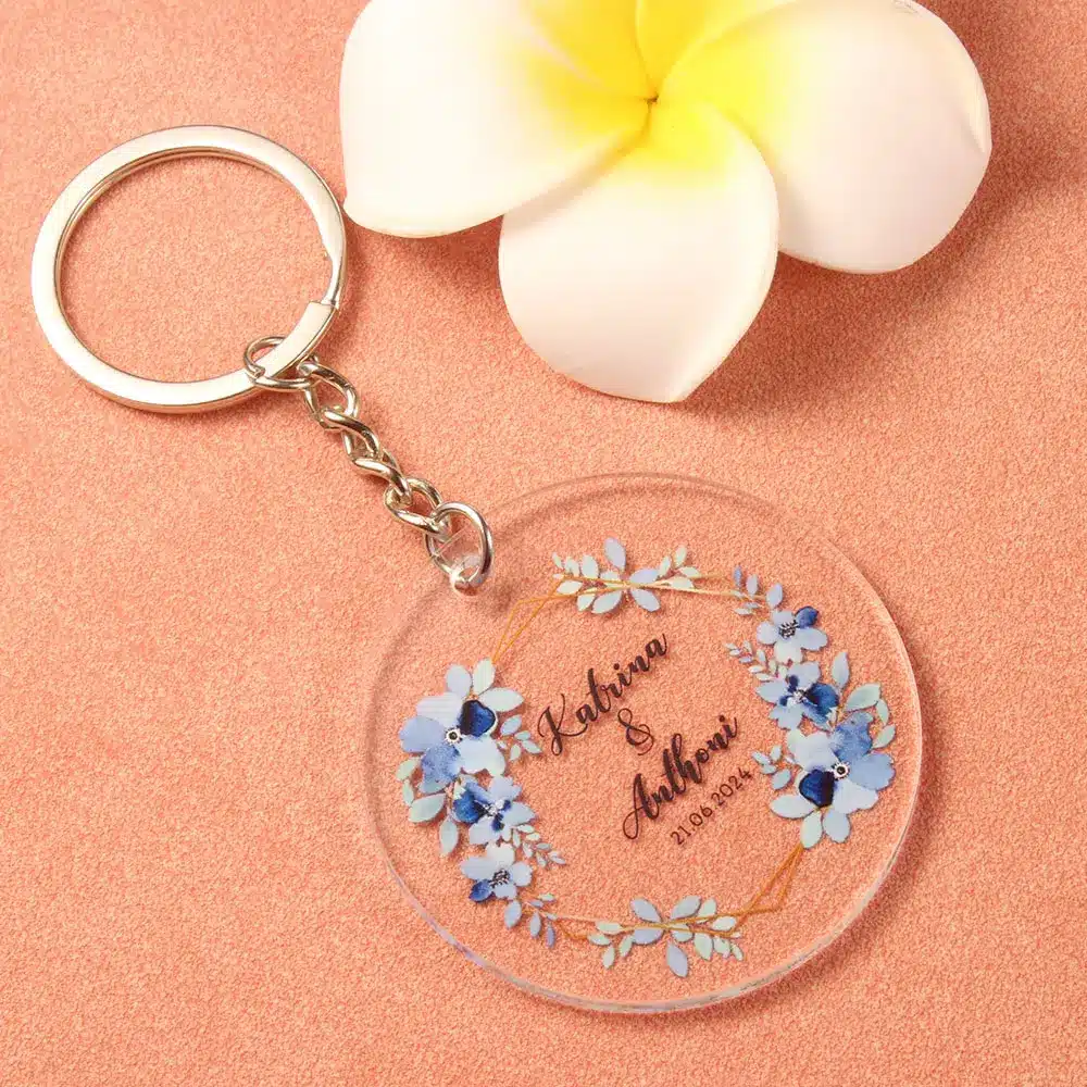 Chaque porte clé couple date est peint à la main avec de la peinture acrylique pour un rendu artisanal unique. Les jolies fleurs peintes s’inspirent de l’univers du mariage pour créer une ambiance romantique.