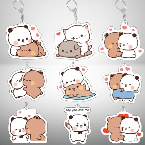 Le porte clé couple kawaii met en scène de petits personnages Dudu Bubu qui se câlinent tendrement, accompagnés de petits cœurs pour accentuer le côté doux et affectueux.