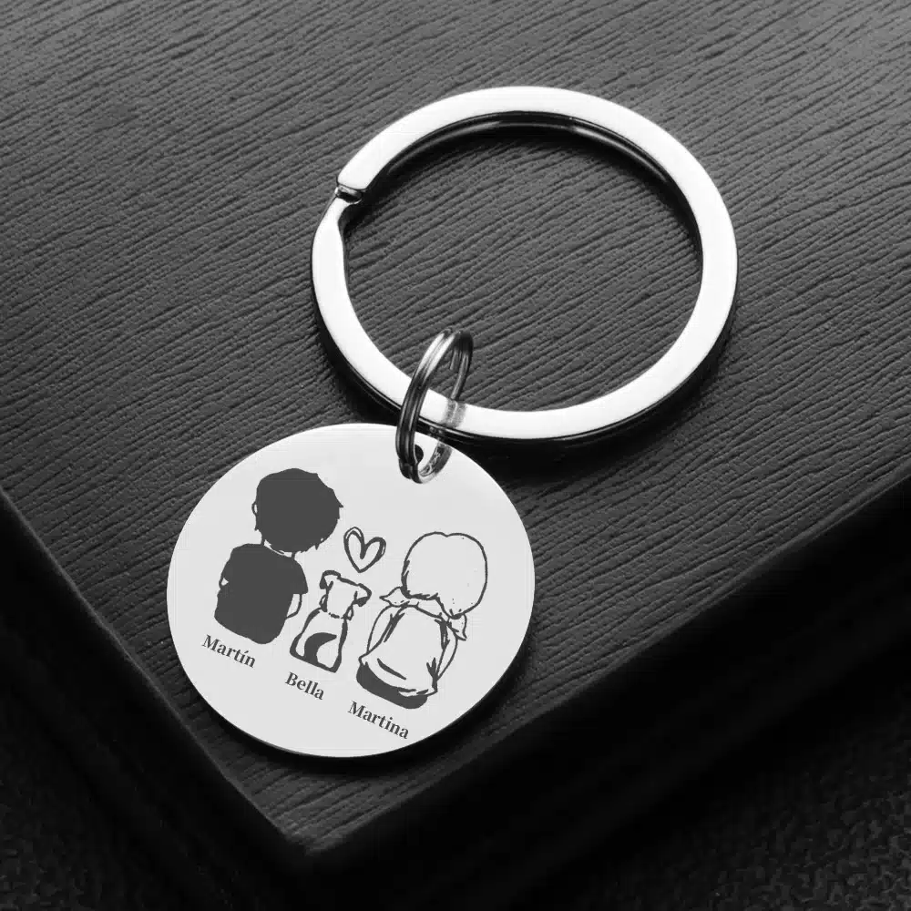Vous pouvez ajouter vos bébés à quatre pattes sur la gravure avec leur prénom, qu’il s’agisse d’un chat ou d’un chien. Cette personnalisation complète transforme ce porte clé couple maman en véritable portrait de famille incluant tous les membres qui comptent pour vous.
