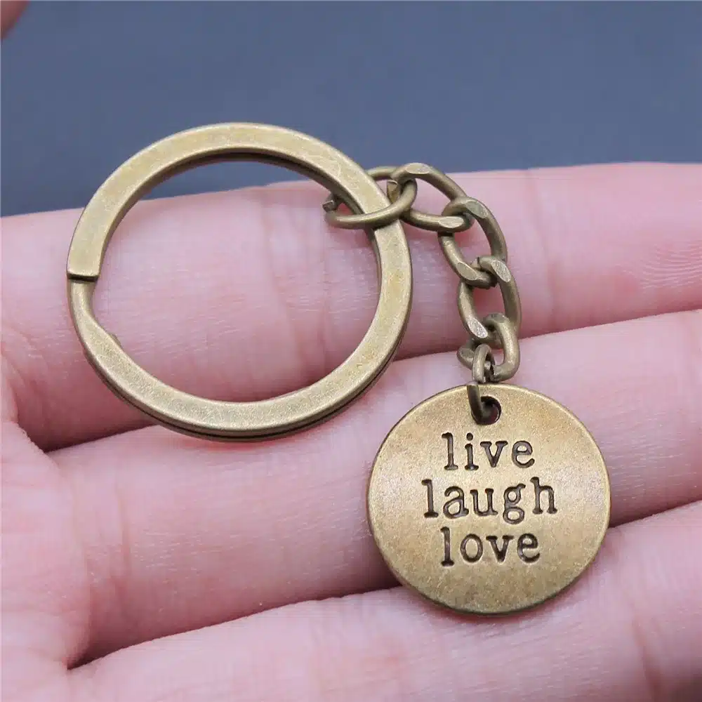 Le porte-clé couple vintage citation affiche la gravure “Live, laugh, love”, simple, positive, facile à reconnaître.