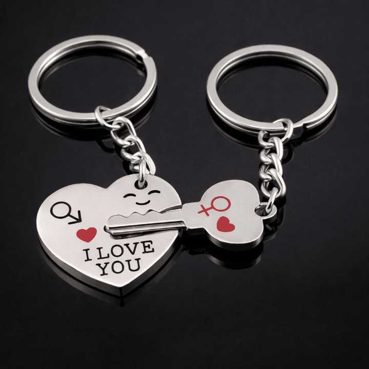 Le cœur est gravé des mots « I LOVE YOU » et la clé porte un petit cœur rouge ainsi que le signe du genre opposé, rappelant que l’un détient la clé du cœur de l’autre.