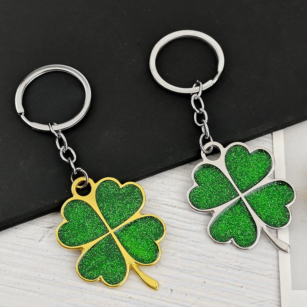 Le porte clés trefles couple réunit deux porte-clés assortis avec un pendentif vert pailleté qui apporte une touche fraîche et lumineuse à vos clés.