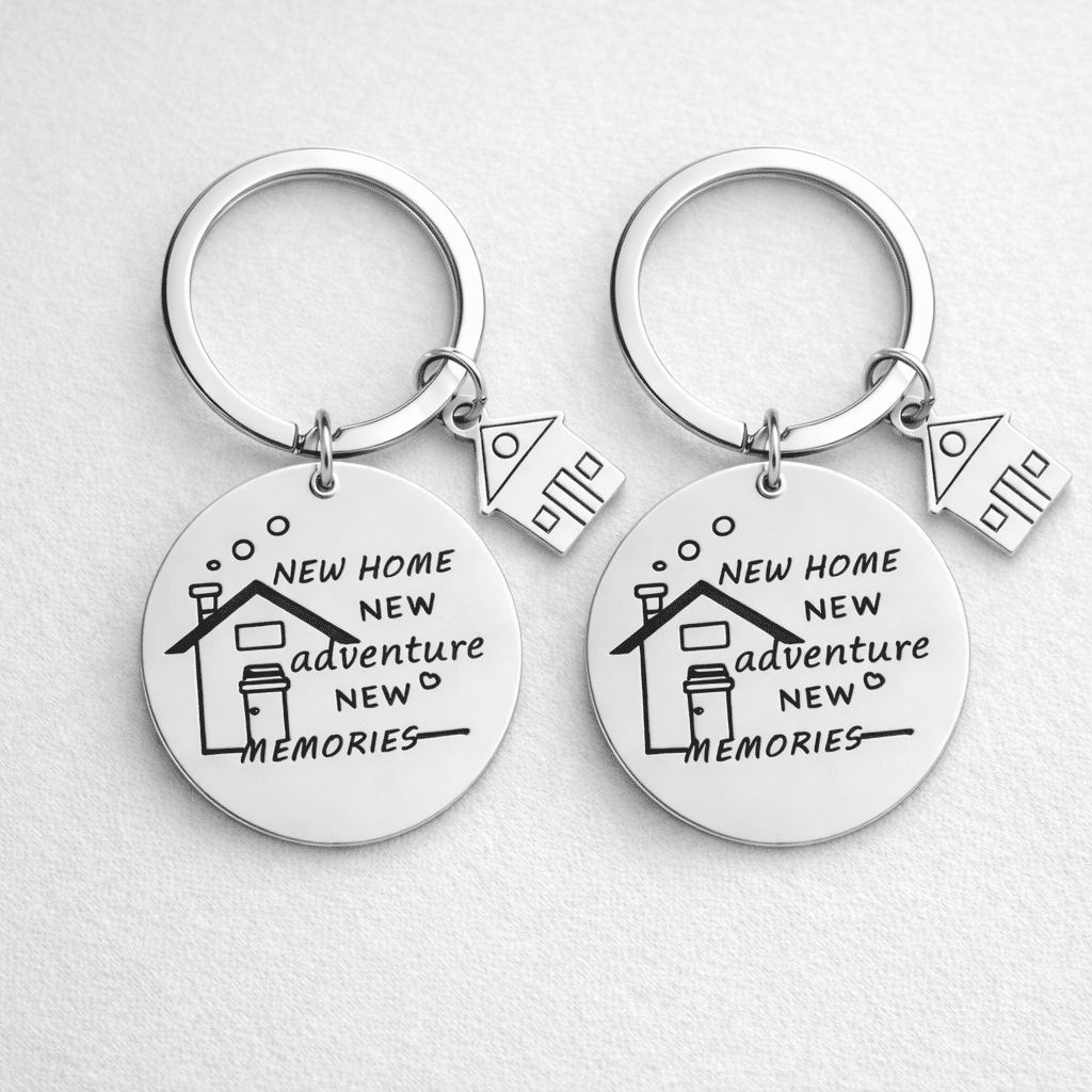 Chaque médaillon rond est gravé du message “New Home, New Adventure, New Memories”, un rappel du nouveau départ que représente un emménagement ou une vie commune.