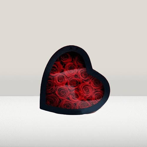 Cette rose éternelle boite coeur mesure 25 x 27 x 11,5 cm et contient 18 roses qui ne faneront jamais.