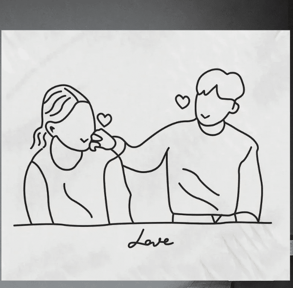 Cette tapisserie romantique met en scène un couple amoureux dessiné avec douceur sur fond blanc, accompagné de petits cœurs discrets et de l’inscription “Love” en écriture attachée.